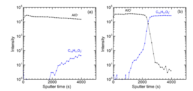 Depth profiling results of 40 nm-thick AI films deposited on bulk PC substrates. (a) Sputtering with Ar-GCIB alone. (b) Cosputtering using Ar-GCIB and Cs+ under the optimized conditions.